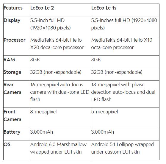LeEco Le 1s and Le 2 both devices come with a 3,000 mAh battery on board. Le 2 comes Android 6.0 Marshmallow, LeEco Le 2 expected to have better battery management features.